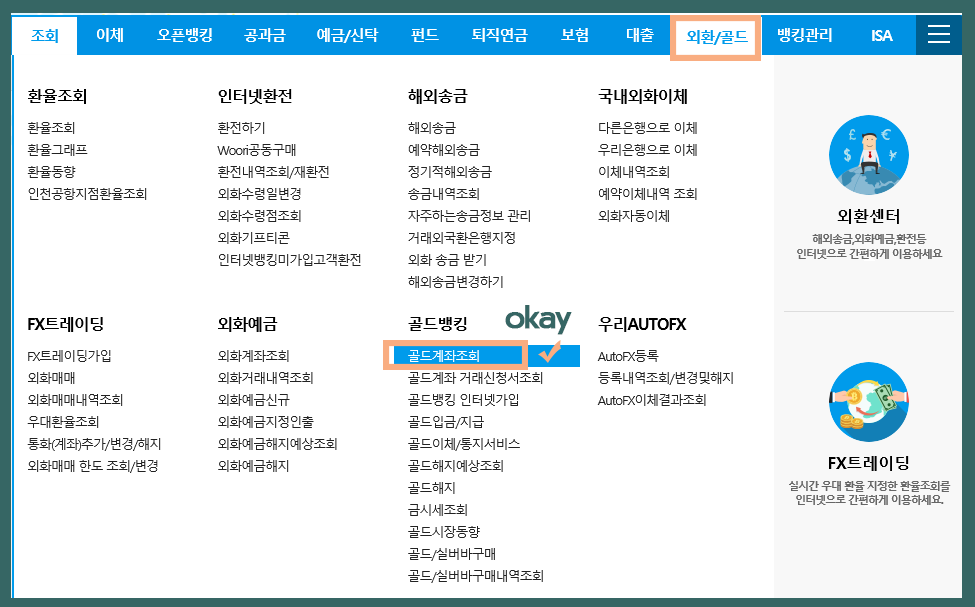 ※ 우리은행 골드계좌 조회방법 : 외환/골드 메뉴에서 골드뱅킹 메뉴로 들어간 뒤 <골드계좌조회>를 누른다.