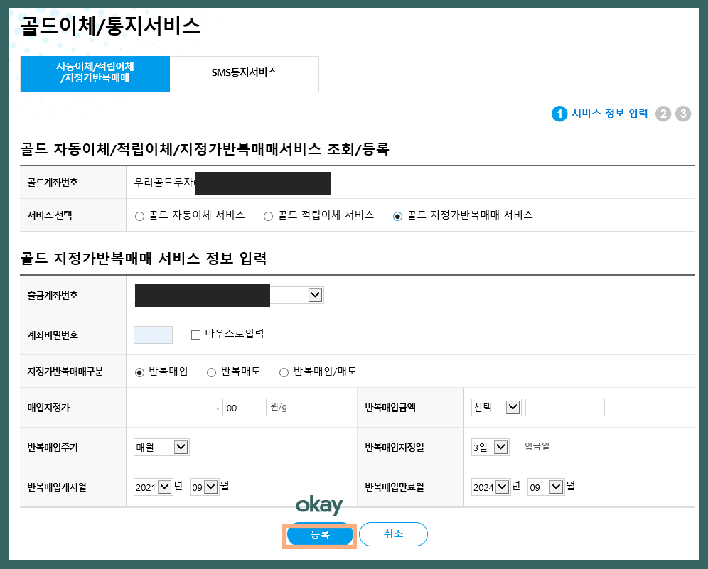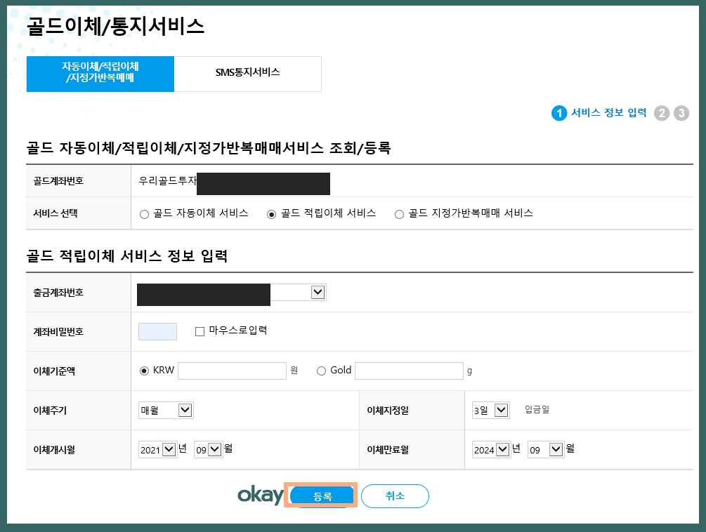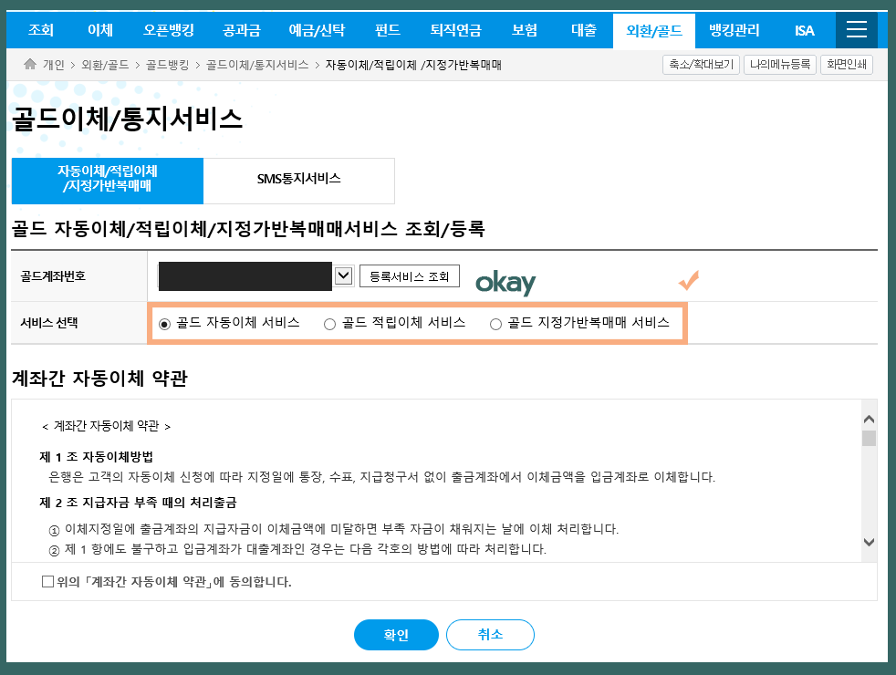 골드 자동이체 서비스, 골드 적립이체 서비스, 골드 지정가반복매매 서비스 중에서 이용하고 싶은 서비스를 선택한 뒤 약관에 동의를 체크하고 확인을 누르면 된다. 이후에 자세한 내용을 선택하여 신청할 수 있다. 단 3가지 서비스 중에서 하나만 선택하여야 하고 중복 가입은 불가하다.