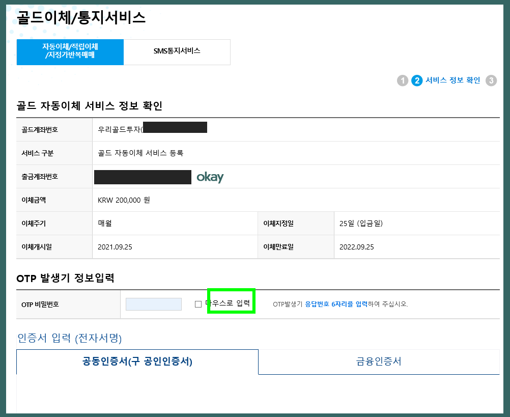자동이체에 대한 내용을 다시 한번 확인할 수 있도록 정보를 보여준다. 신청하려는 내용이 맞다면 OTP발생기의 번호를 입력하고 공인인증서로 인증을 해야 최종 신청이 완료된다.