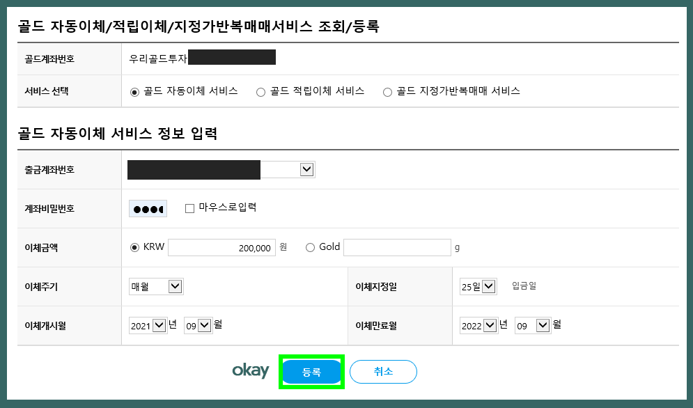 골드 자동이체 서비스를 신청하기 위해서는 출금계좌를 어디로 할 것인지 선택을 한다. 그리고 이체금액을 기재하거나 이체 수량을 기재해서 원하는 만큼 선택 입력한다. 그리고 이체주기, 이체 지정일자, 이체 개시 월, 이체 만료일을 각각 선택한 뒤 등록을 누른다.