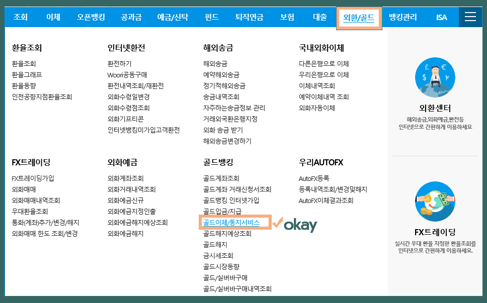 서비스를 이용하기 위해서는 우리은행 메뉴에서 외환/골드 - 골드뱅킹 - 골드이체/ 통지서비스로 들어가면 된다.