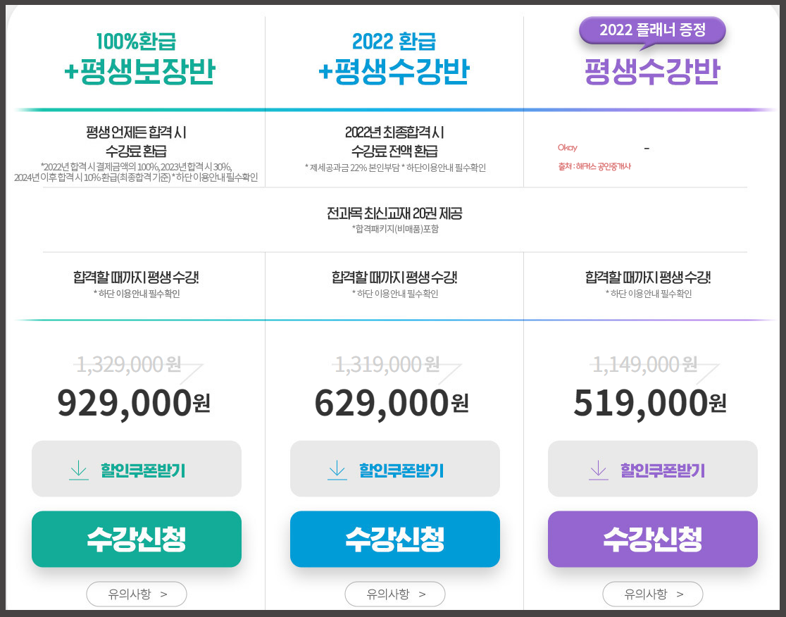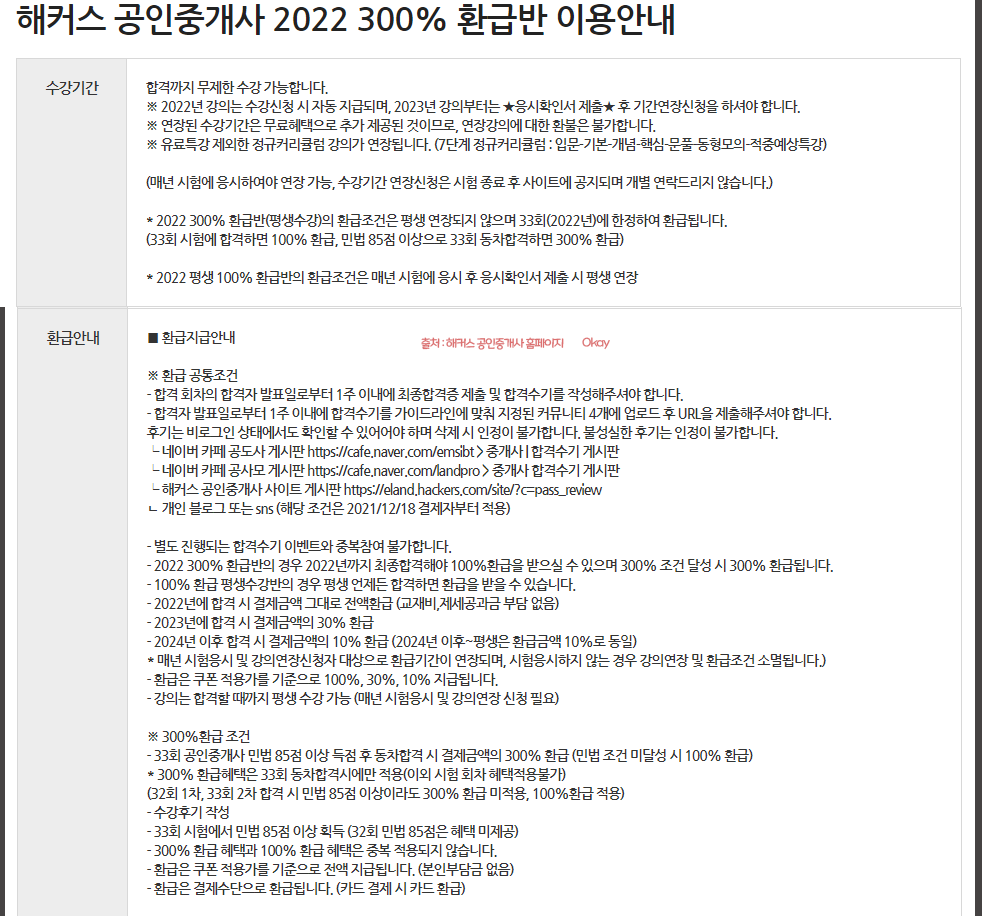 2022년 이후에도 환급을 해주는 100%환급+평생보장반 : 해커스의 경우에는 2023년 이후로도 환급을 해주는 경우가 있으나 환급액은 현저히 줄어드는 형태이다. 2023년에 합격하면 30%를 환급해주고 그 이후로는 언제든 합격하면 10%를 환급해주는 방식이다.