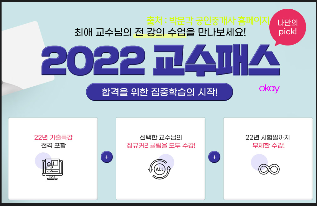 교수패스는 다른 강의보다 현저히 저렴한데요. 그 이유는 바로 교재가 미포함!이라는 사실. 그리고 교수님을 선택해서 결정해야 합니다. 그러니까 원하는 교수님이 정해져 있는 사람이라면 저렴하게 강의를 수강할 수 있다는 거죠! 그렇다고 강의를 조금만 듣게 되는 건 아닌가 걱정할 필요는 없네요. 기출특강도 포함되고 선택한 교수님의 정기 커리큘럼을 모~두 수강할 수 있습니다. 거기다 2022년 시험까지 무제한 수강!