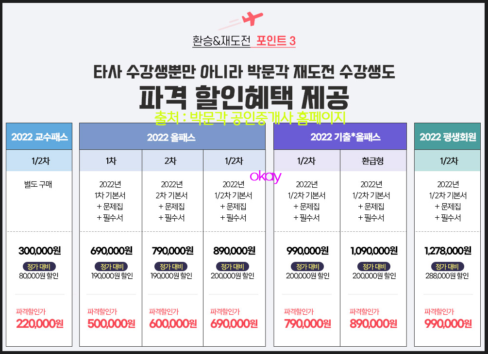박문각에서 유일한 환급형 수강권! 환급형 기출 올패스는 현재 할인가로 99만원에 판매되고 있는데요. 환승 재도전의 경우는 89만원입니다. 박문각의 환급형은 22%제세공과금을 제외하고, 교재비도 제외한다는 점은 알고 있어야겠습니다. 그리고 2022년에 동차로! 합격 시에만 지급하는 상품입니다.