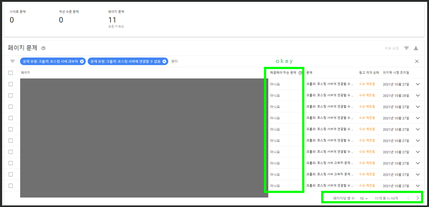 페이지 문제가 11개가 있다고 하면서 이렇게 어떤 페이지가 문제가 있는지 링크가 나옵니다. 이 리스트는 페이지당 10개만 보이기 때문에 10개가 넘어가는 경우는 하단에 오른쪽 화살표를 눌러야 다음 페이지를 볼 수 있습니다. 내가 게시한 글 중에서 어떤 게 문제 있는지 확인하고 싶으면 각 페이지마다 파란색 링크를 누르면 바로 연결이 가능해서 확인할 수 있습니다.