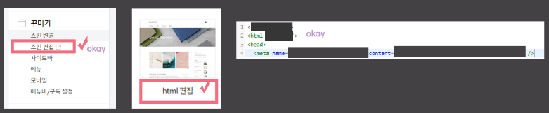 티스토리에 로그인해서 블로그 관리자 페이지로 들어가 주세요. 메뉴에서 <꾸미기>의 <스킨편집>을 누른 뒤 <html 편집>으로 들어가야 합니다. 여기서 <head>가 보이는데요. <head>의 바로 다음 줄에 복사해둔 네이버 서치어드바이저의 메타태그를 붙여 넣고 적용을 해주시면 됩니다.