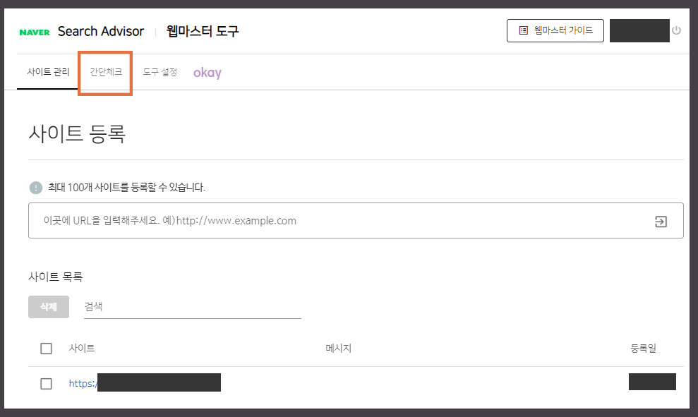 웹마스터 도구에서는 <사이트 관리>와 <간단 체크>, <도구 설정>을 할 수 있는 탭이 보입니다. 우리는 티스토리 블로그를 등록할 거니까 <사이트 관리> 화면에서 진행하면 됩니다.