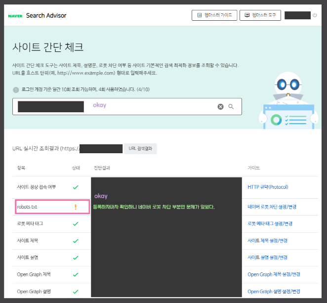 "사이트 간단 체크 도구는 사이트 제목, 설명문, 로봇 차단 여부 등 사이트 기본적인 검색 최적화 정보를 조회할 수 있습니다." " 로그인 계정 기준 일간 10회 조회 가능하며, 4회 사용하였습니다. (4/10)"