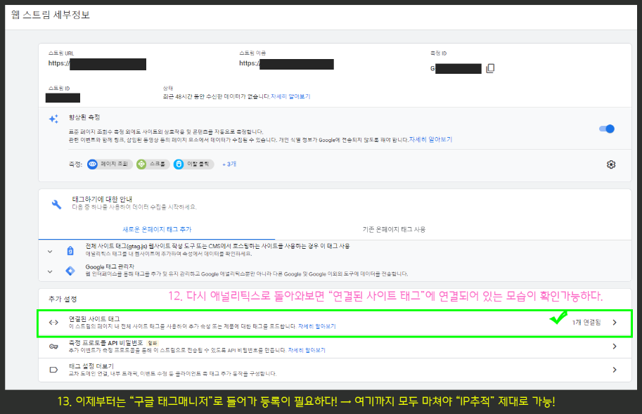 이제 또! 애널리틱스 페이지로 돌아오세요. 이제 추가 설정에 보면 '연결된 사이트 태그'라는 글자가 보이는데요. 요기에 '1개 연결됨'이라고 되어있으면 잘하신 겁니다.