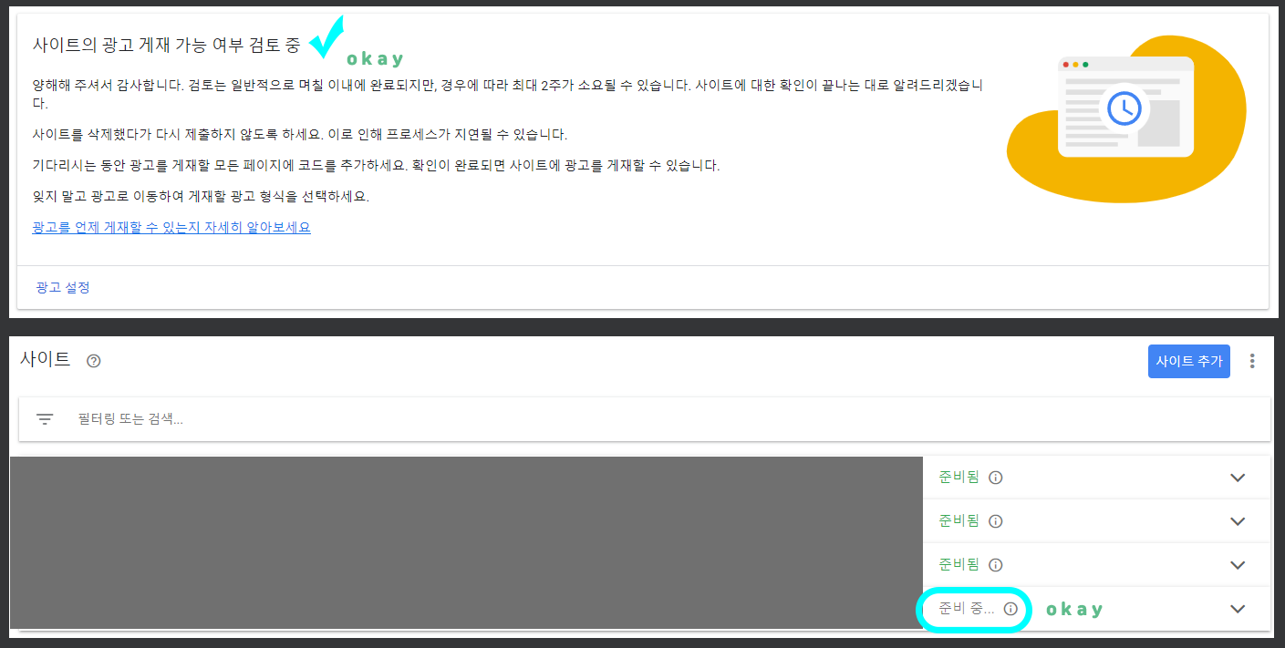 검토요청을 하면 "사이트의 광고 게재 가능 여부 검토 중"이라는 알림을 확인할 수 있다. 그리고 제대로 신청되었는지 궁금하다면 다시 애드센스의 메인에서 "사이트 - 개요"로 들어가 본다. 그러면 아까 "주의 필요"라고 되어있던 목록이 "준비 중..."으로 바뀐 것으로 확인할 수 있다.