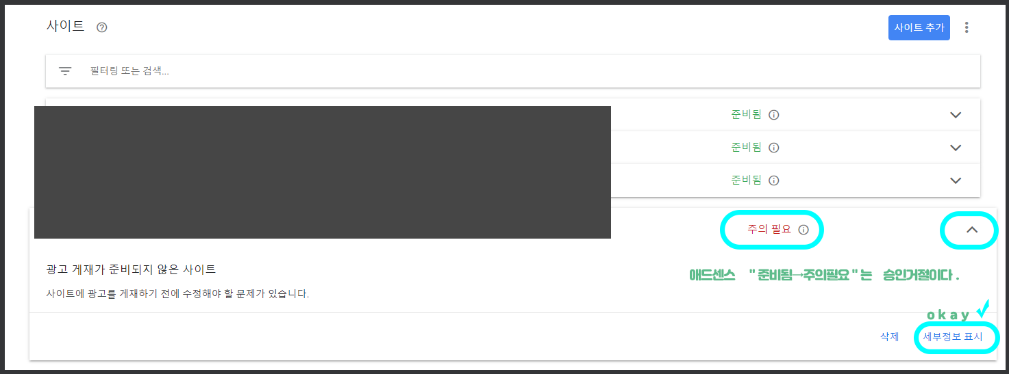 애드센스 승인신청 후 승인거절이 되었다면 "주의 필요"로 바뀌어 있다. 화살표를 눌러 하단오른쪽, "세부정보 표사"를 누르자.