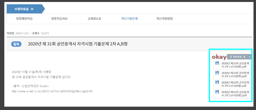 2020년 제31회 공인중개사 자격시험 기출문제 2차 A,B형을 눌렀더니 내용엔 유의미한 건 없구요. 오른쪽에 첨부파일에 4라는 숫자가 보입니다. 첨부파일버튼을 누르면 다운로드 할 수 있는 파일들이 보입니다.